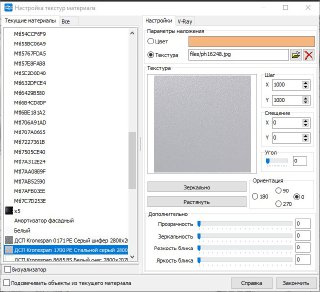 если название материала содержит "Fasad1" или "Fasad2" или "Fasad3" или "Фасад1" или "Фасад2" или "Фасад3" то детали этого материала будут с прозрачностью 50%.